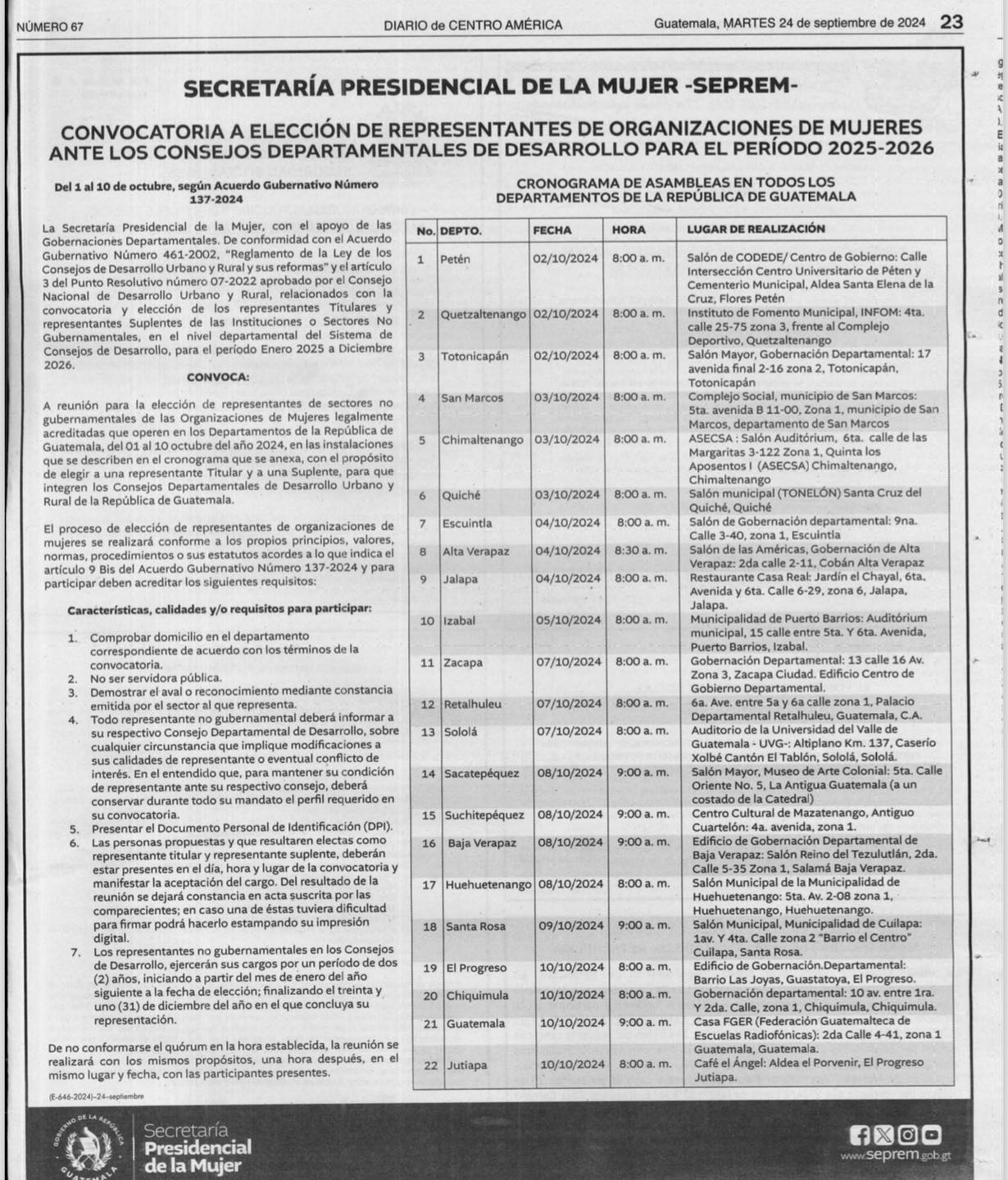 CODEDE Y COREDUR Convocatoria a elección de representantes de organizaciones de mujeres ante los Consejos Departamentales de Desarrollo para el período 2025-2026 Publicado Hace 2 años en 24 septiembre, 2024 Por Gobernación Departamental de Jalapa Temas Relacionados:portada Leer más Tendencia